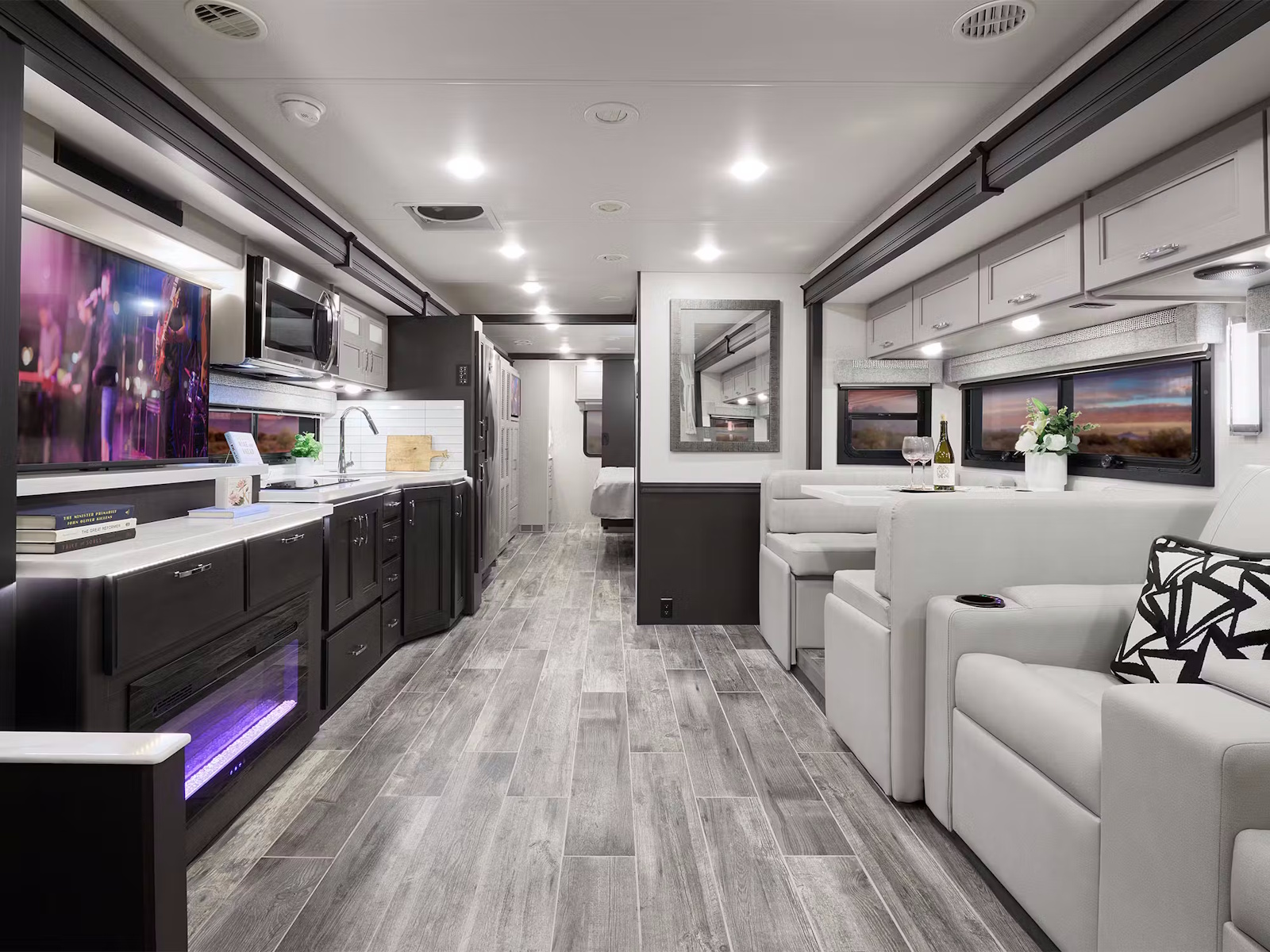 • Turn every stop into a gourmet experience with the Inception® HD’s kitchen. Stock up for the journey thanks to the residential fridge that includes a built-in water and ice dispenser, and keep your favorites organized in the pantry. When it’s time to cook, the two-burner induction cooktop and convection microwave oven with air fryer capabilities make it easy to go from quick bites to full-course dinners. Clean up easily afterward using the double-bowl stainless steel sink with a pull-down sprayer.