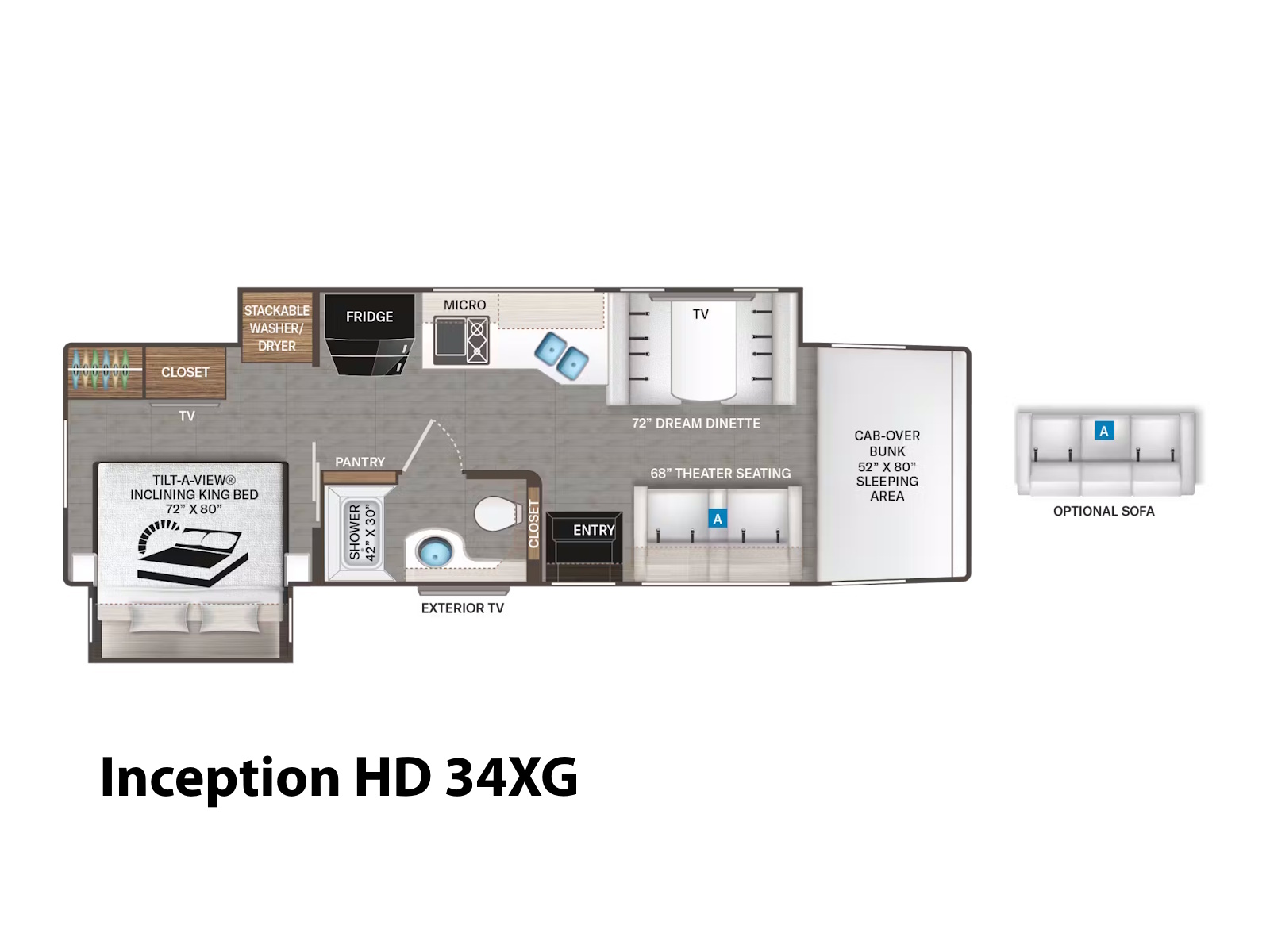 • Level up your travel lifestyle in the Inception® HD, where comfort meets luxury at every turn. Kick back in plush theater seating that reclines and includes built-in heat, massage, USB ports, footrests, and cup holders for your favorite beverage. Gather around the Dream Dinette® with a wireless phone charger and USB plug on the tabletop, perfect for meals, card games, or late-night chats. When the temperature dips, turn on the electric fireplace in the 38DX, 38FX, and 38XL floor plans for a cozy ambiance.