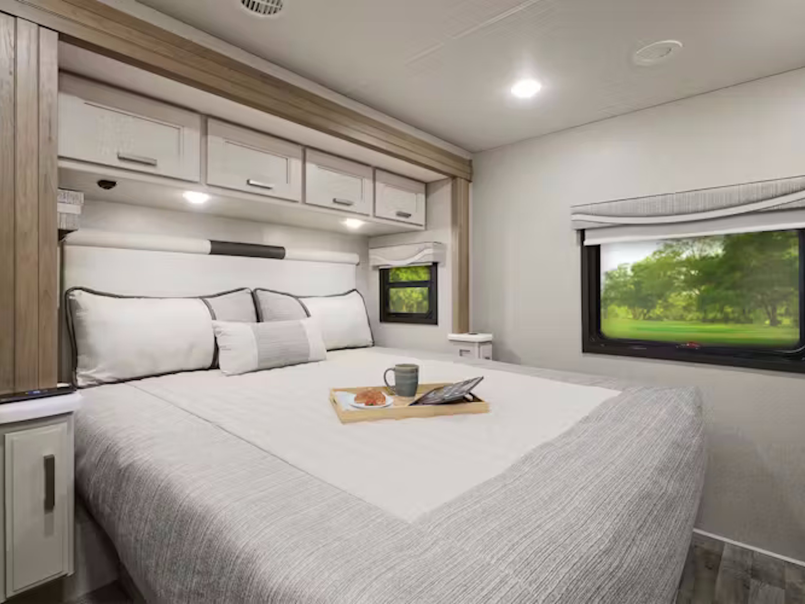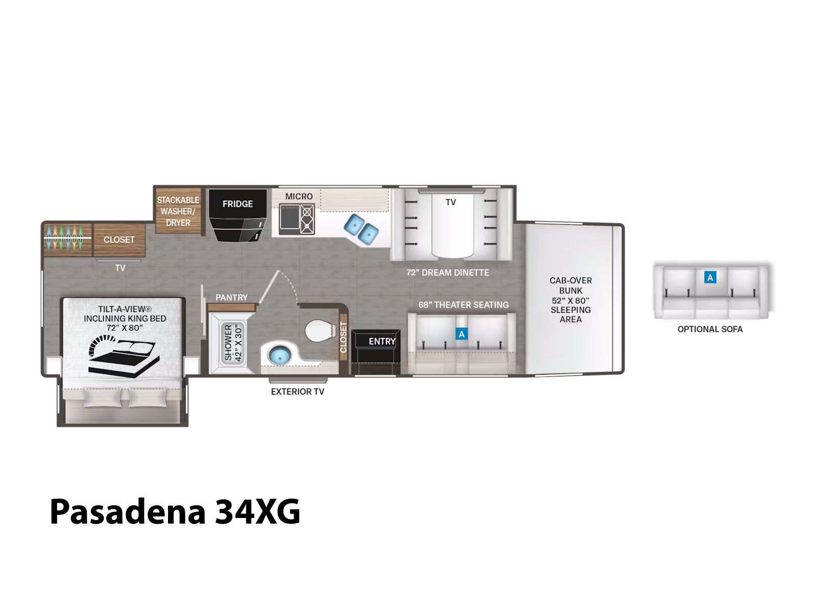 - Recharge comfortably in the Pasadena®, where every model features a roomy King bed with a Tilt-A-View® inclining mechanism for relaxing and watching TV in the bedroom. A cozy cab-over bunk with a shaded skylight offers a perfect spot for stargazing, while the Dream Dinette® easily converts into an extra bed for guests. If you’re traveling with a bigger crew, the 38XL floor plan includes bunk beds to sleep the whole family comfortably. Plus, powering your devices is easy with wireless and USB charging ports built into the nightstands.