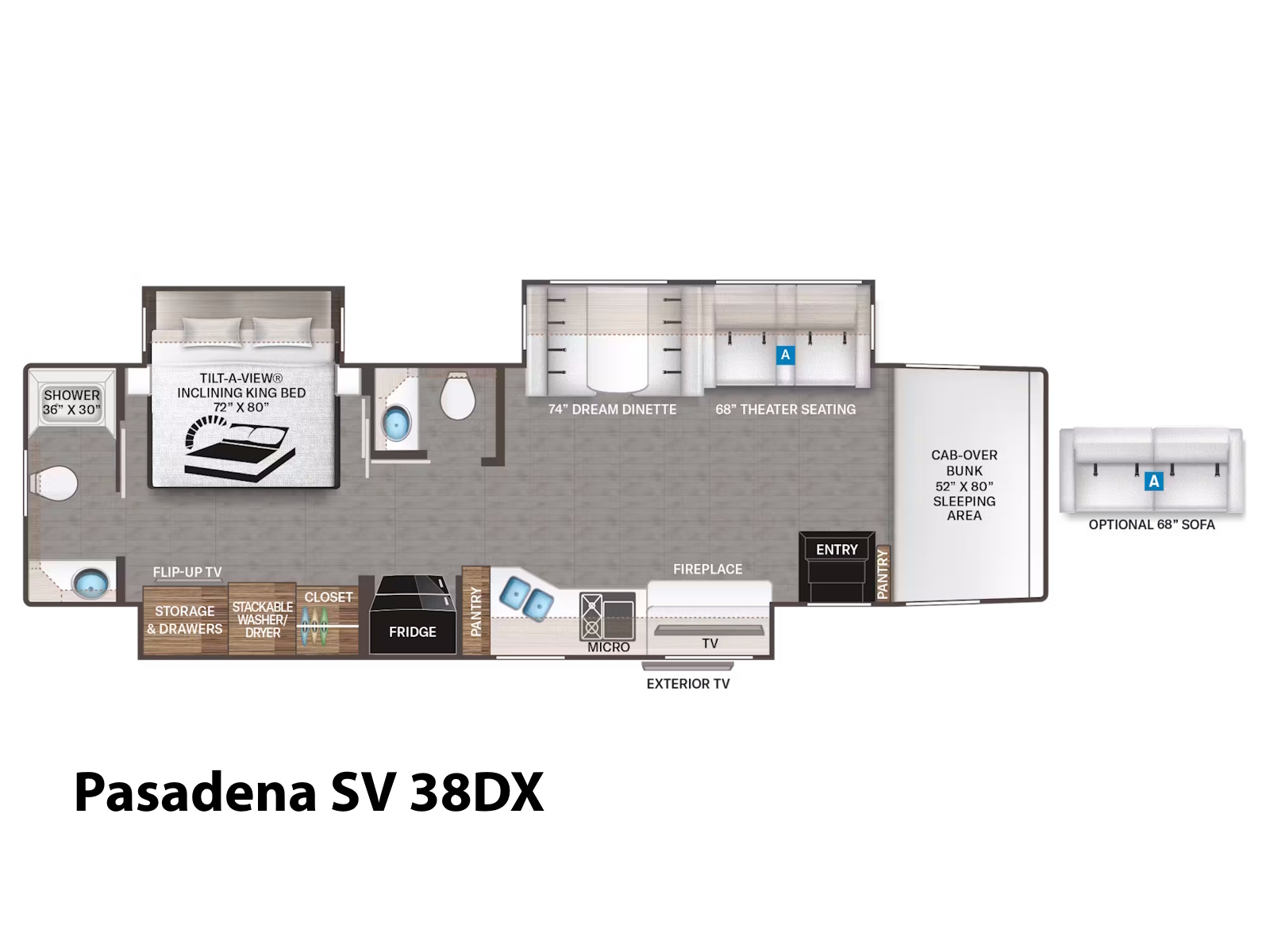 - When it’s time to wind down, the Pasadena® SV delivers next-level comfort for every kind of traveler. Stretch out on the King bed with a Tilt-A-View® feature that lets you kick back and watch TV or read a book in total relaxation. Above the cab, a cozy bunk with a shaded skylight doubles as a front-row seat for stargazing. If you need more sleeping space, the Dream Dinette® quickly converts into a bed for overnight guests, and the 38XL model steps it up with bunk beds perfect for kids or adventure buddies.