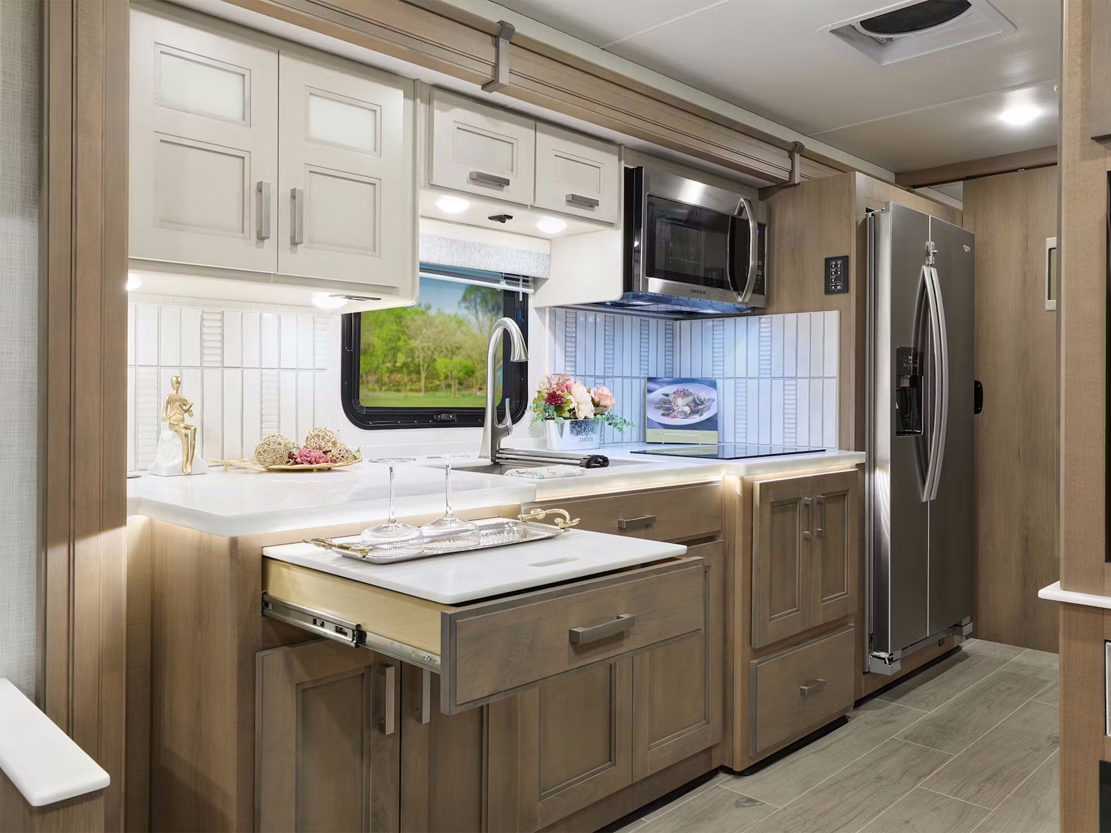 Bring your inner chef to life, no matter where you roam in the Pasadena® SV. Create yummy meals with the two-burner induction cooktop or sizzle something crispy in the convection microwave with air fryer capabilities. A residential refrigerator with an in-door water and ice dispenser keeps your ingredients ready to use, while a double-bowl stainless-steel sink with a pull-down sprayer makes cleanup feel effortless. With a kitchen this dialed-in, even campsite cooking becomes a gourmet experience.