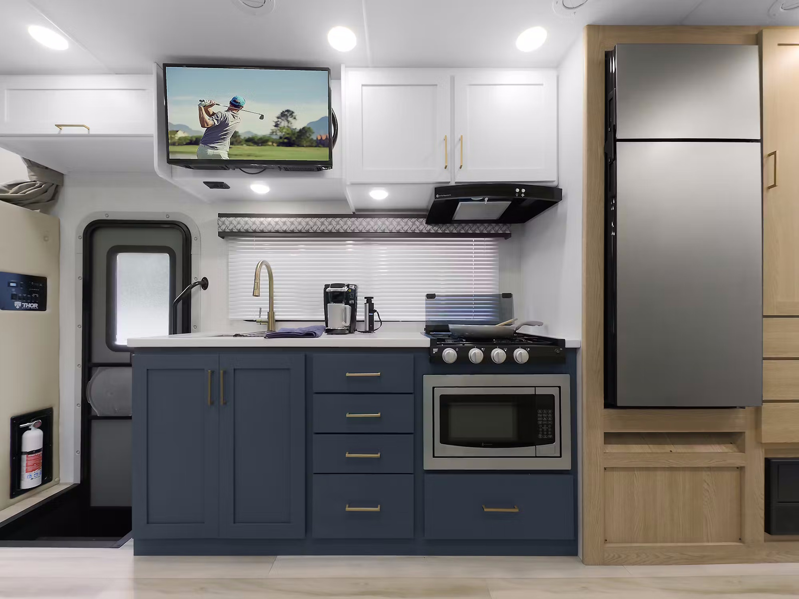 - Ditch the takeout and cook your favorite meals inside the Quantum®, featuring a 12-volt refrigerator and a single-bowl stainless-steel sink with a pull-down sprayer. The LX19 floor plan has an additional quick-access pull-out fridge. All ESpec models feature a two-burner gas cooktop and a convection microwave oven with an air fryer. The KW29, LF31, and HS31 offer a two-burner gas cooktop with a single induction burner for more versatility, while the LC28 has a recessed three-burner gas cooktop/oven with a microwave oven. Many floor plans also have a flip-up countertop extension for additional prep space.