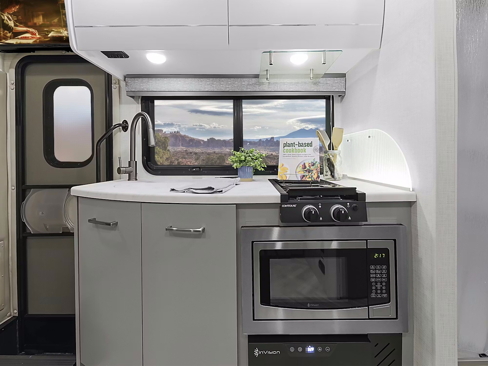 - Cook your favorite meals wherever the road takes you in the Tiburon®. This well-equipped kitchen includes a 12-volt refrigerator, convection microwave oven with air fryer, stainless-steel single-bowl sink, and a two-burner gas cooktop to prepare tasty dishes on the go. The 24RW floor plan features a convenient flip-up countertop extension if you need more room to prep. In the 24FB, 24TT, and 24XL models, a pop-up countertop outlet charging center powers your devices and keeps them close at hand while you cook.