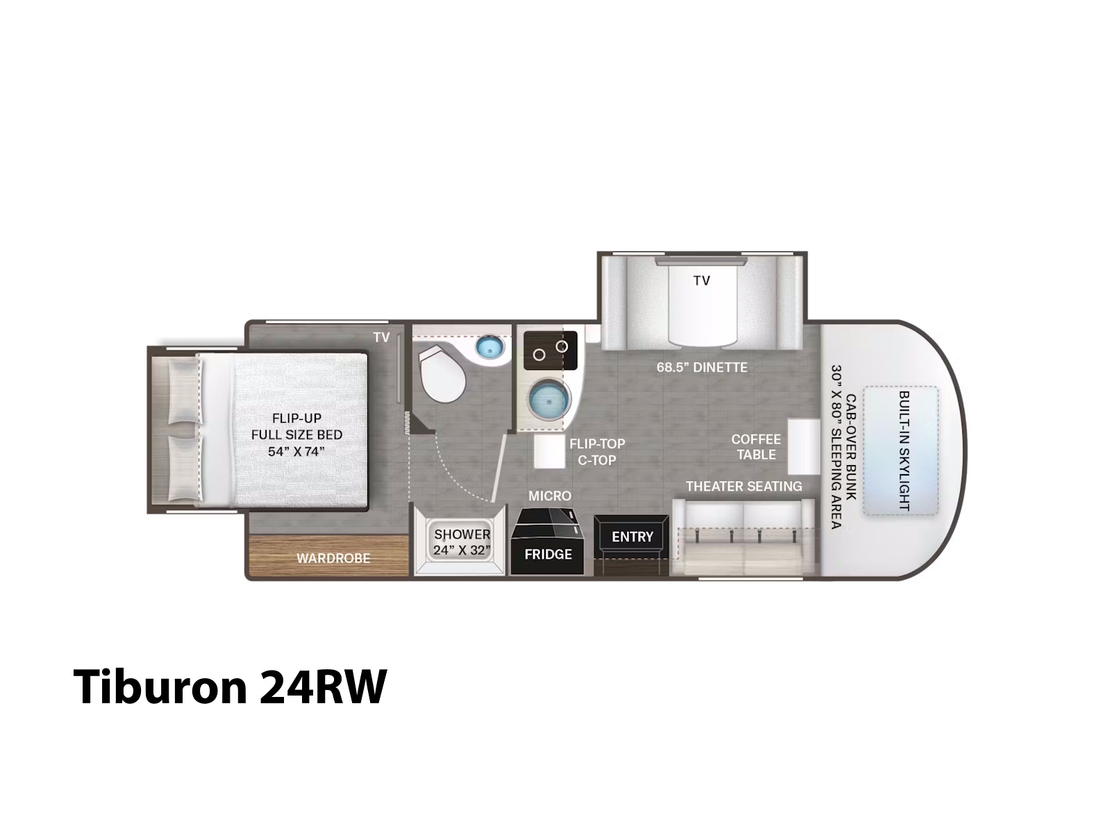 - Unwind and recharge wherever your adventures take you in the Tiburon®. The 24FB floor plan features a versatile Queen-size Murphy bed sofa that transforms your living space into a cozy bedroom. Save space with the 24TT model’s flip-up Queen-size bed or the 24RW layout’s flip-up full-size bed, both great options for opening up the interior when not in use. If traveling with a partner or friend, the 24XL floor plan delivers flexibility with twin beds that convert into a roomy King, giving you plenty of space to stretch out and relax.