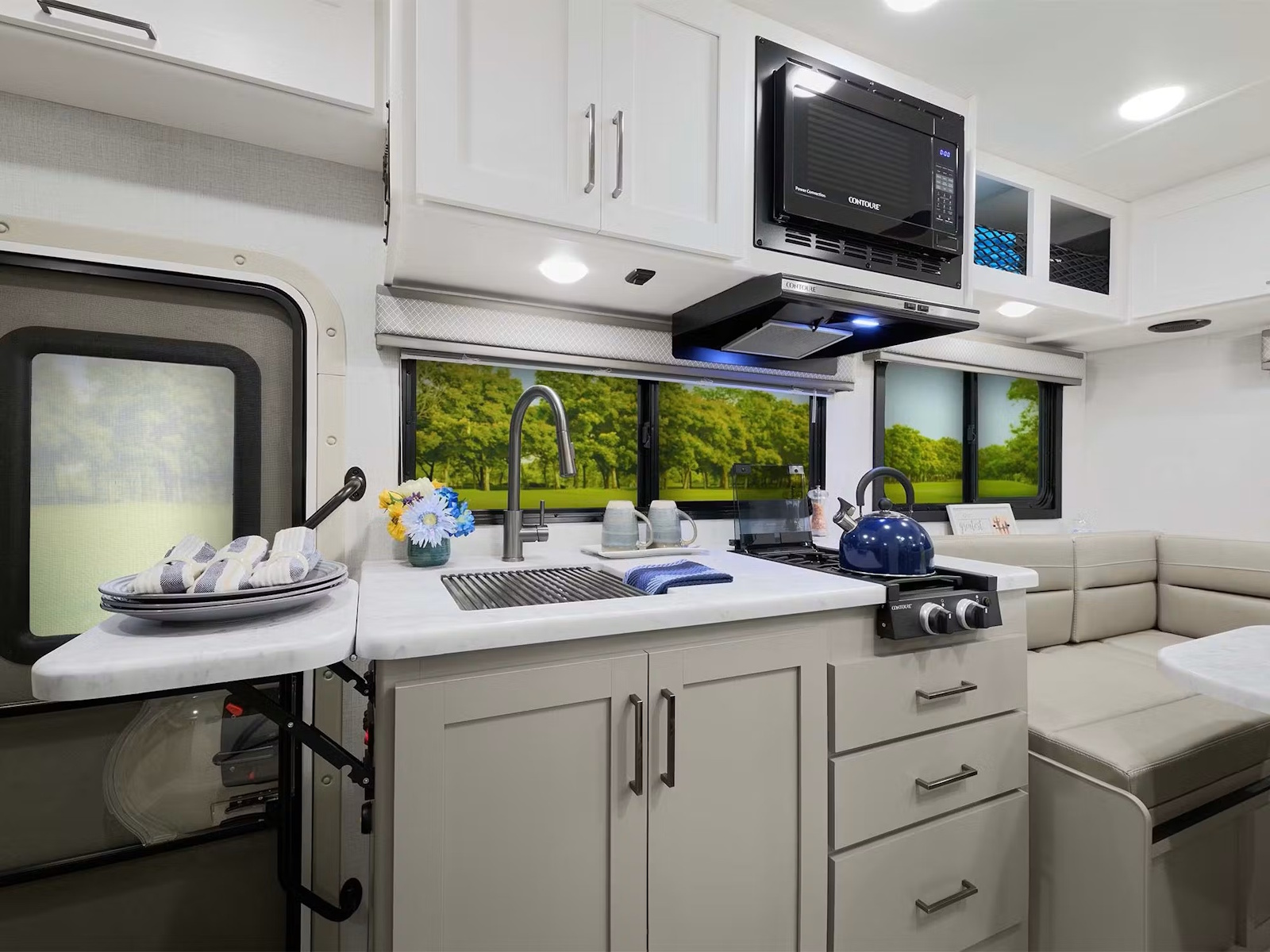 - Whip up meals easily in the Chateau®. All floor plans include a 12-volt refrigerator and a stainless-steel single-bowl sink with a pull-down sprayer. Store more snacks and drinks in the 19X model’s additional pull-out fridge. Inside the 28Z, 29K, 31E, and 31H, you’ll have a three-burner gas cooktop, microwave oven, and a pop-up countertop charging center to power your appliances. ESpec models switch things up with a two-burner gas cooktop and a convection microwave with an air fryer for flexible cooking solutions on the go.