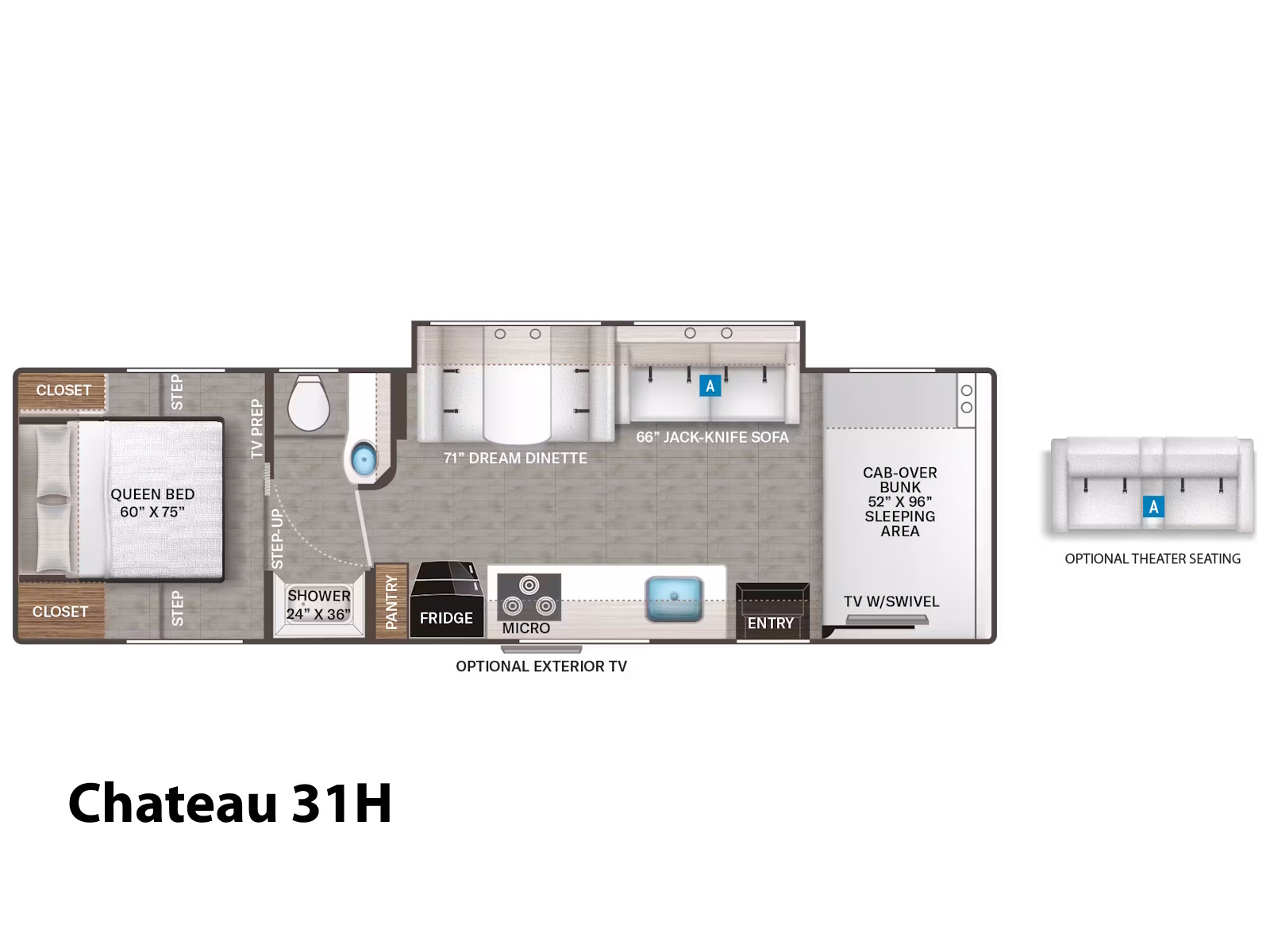 - Step into the Chateau® and experience an interior that’s functional and inviting. Most layouts include the Dream Dinette®, which converts from mealtime seating to an extra sleeping space. The 19Z features a roomy rear U-shaped dinette with the same dual-purpose design instead of a dinette booth, while the 19X has bench-style seating and a Lagun table system for more flexibility. In the 28Z, 29K, 31E, and 31H floor plans, unwind on the jack-knife sofa or replace it with the optional theater seating. The 28G model also has a jack-knife sofa.