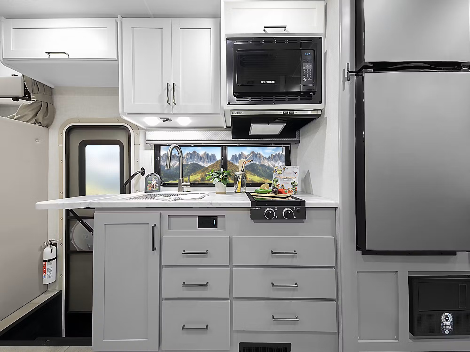 - Whip up meals easily in the Chateau®. All floor plans include a 12-volt refrigerator and a stainless-steel single-bowl sink with a pull-down sprayer. Store more snacks and drinks in the 19X model’s additional pull-out fridge. Inside the 28Z, 29K, 31E, and 31H, you’ll have a three-burner gas cooktop, microwave oven, and a pop-up countertop charging center to power your appliances. ESpec models switch things up with a two-burner gas cooktop and a convection microwave with an air fryer for flexible cooking solutions on the go.