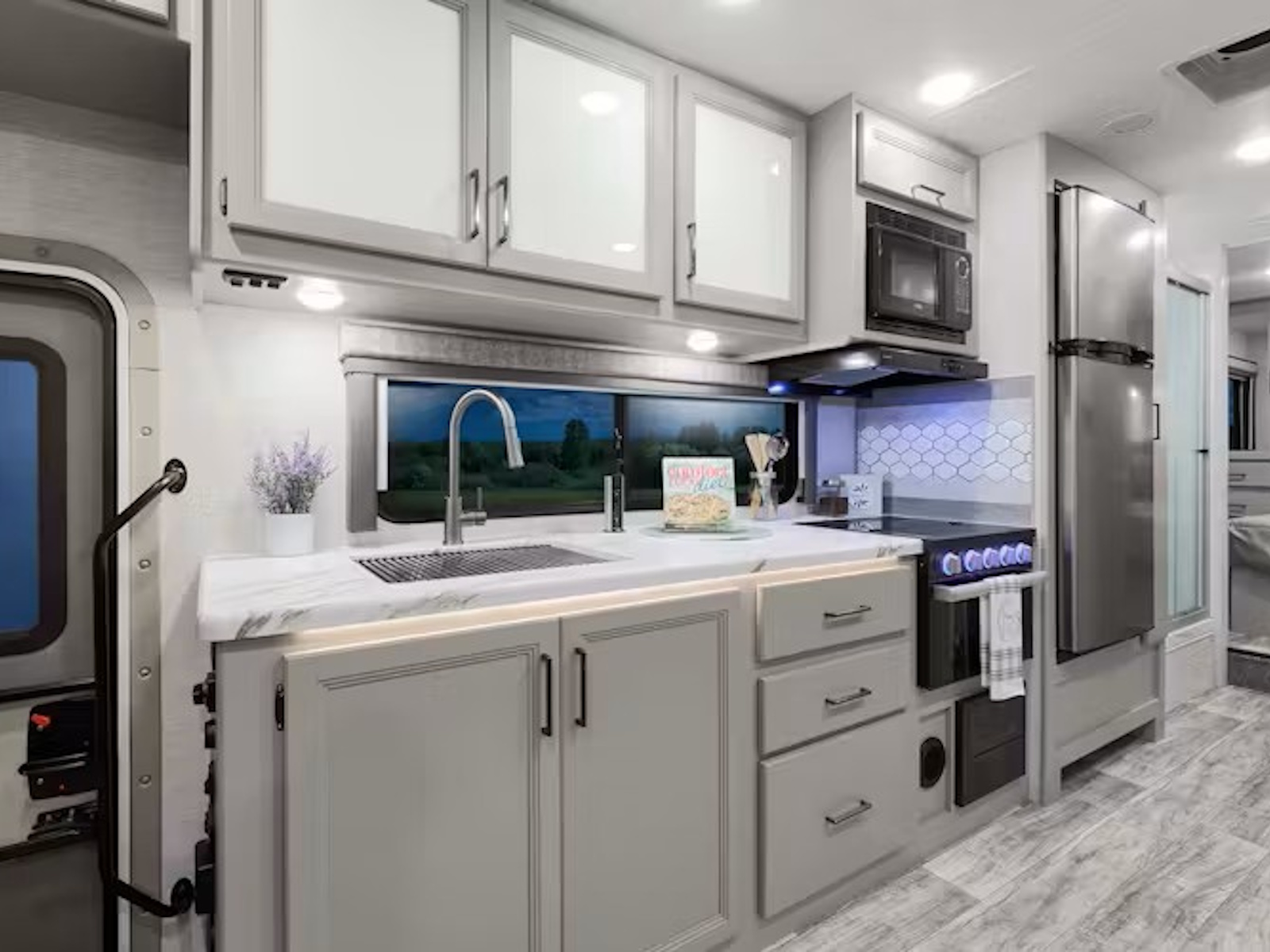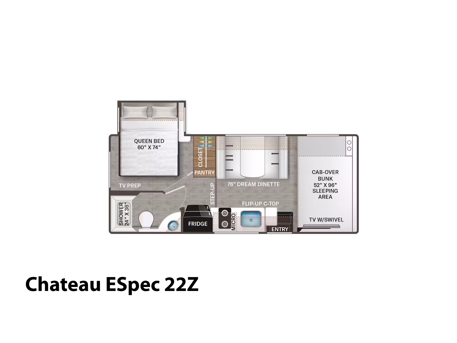 - Whip up meals easily in the Chateau®. All floor plans include a 12-volt refrigerator and a stainless-steel single-bowl sink with a pull-down sprayer. Store more snacks and drinks in the 19X model’s additional pull-out fridge. Inside the 28Z, 29K, 31E, and 31H, you’ll have a three-burner gas cooktop, microwave oven, and a pop-up countertop charging center to power your appliances. ESpec models switch things up with a two-burner gas cooktop and a convection microwave with an air fryer for flexible cooking solutions on the go.
