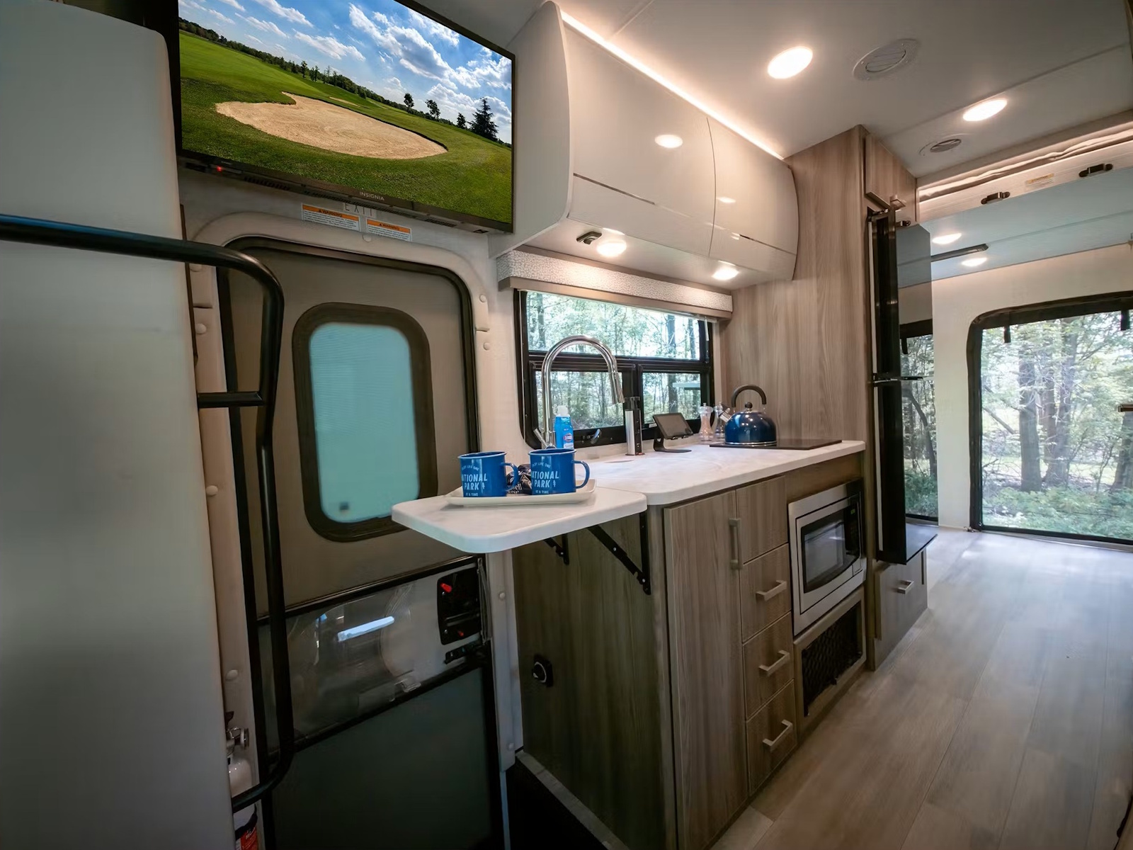 - Make road trips a breeze with the AM/FM dash radio, featuring SYNC® 4 technology, built-in navigation, and an 8-inch color multi-function display. Enjoy your favorite satellite radio channels with the SiriusXM® tuner and antenna, and control the volume easily using the steering wheel audio controls. Stay connected and entertained with the Winegard® ConnecT™ 2.0 system, an all-in-one Wi-Fi router, 4G hotspot, and TV antenna. Wind down after a day of adventure in the living area by watching your favorite shows on the 32-inch Smart TV, or use the convenient charging center with a net to power up your devices.