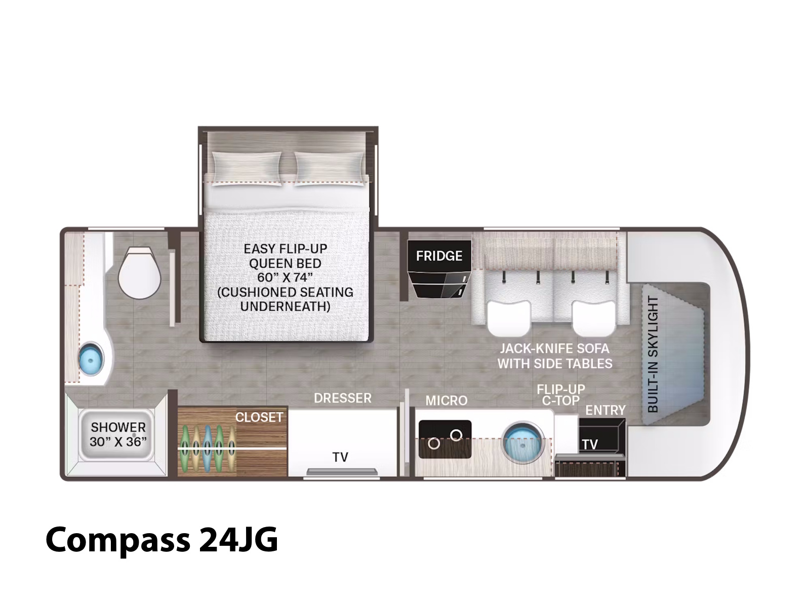 - Rest comfortably after a day of adventure in the Compass AWD®. The 23TW and 24JG floor plans offer a space-saving flip-up, Queen-size bed with cushioned seating underneath. If you’re traveling with your partner or friends, the 24KB has twin beds that can convert into a convenient King-size bed. Inside the Compass® GO 22MT, you’ll find an electric drop-down Queen-size SkyBunk® bed that extends with the simple touch of a button for easy day-to-night living. The bed can be positioned to accommodate gear and other stored items, making it the perfect motorhome for adventurous solo travelers and couples.