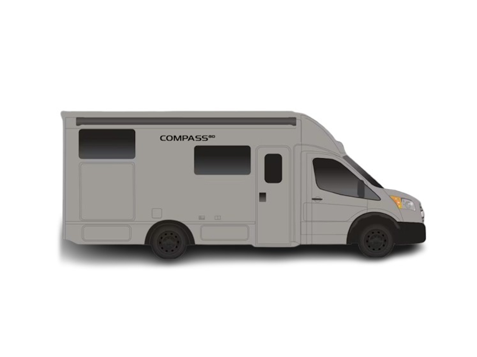 - The Compass AWD® stands out with its sleek, black frameless windows and modern exterior. It features black aluminum wheels, optional paint or graphics packages, and a streamlined build that’s easy to maneuver. Relax under the power patio awning with integrated LED lighting for an elevated outdoor experience. Turn heads with the Compass® GO, featuring off-road-inspired front fender flares and a front grille with additional LED clearance lights. Store your bikes and camping essentials in the MEGA-Storage™ area, which has rear and camp-side access, floor drawer storage, and built-in cubbies.