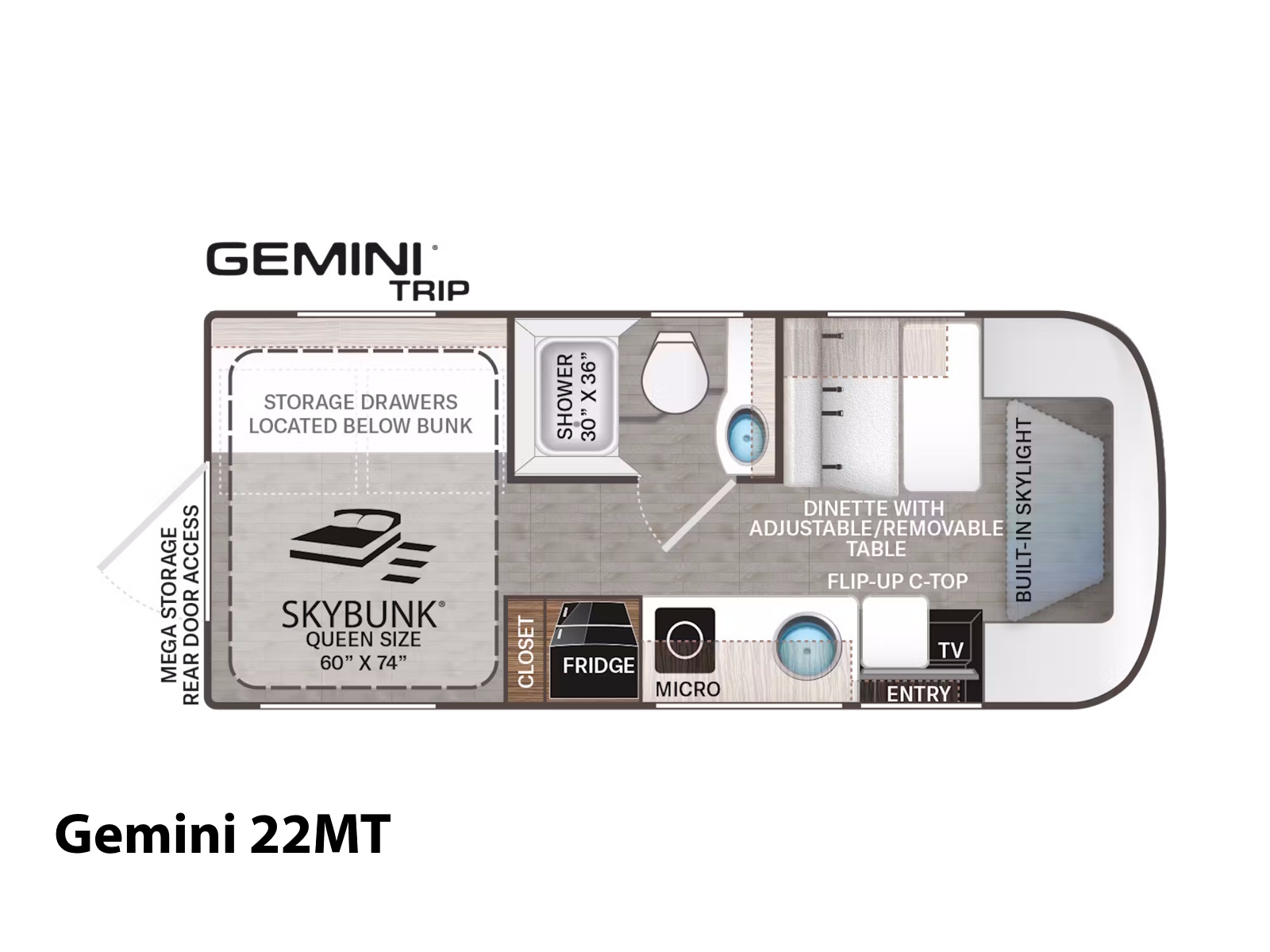 - Recharge in comfort after a full day of exploring in the Gemini AWD®. The 23TW and 24JG layouts feature a smart flip-up Queen-size bed with cushioned seating below, maximizing space and functionality. For couples or friends traveling together, the 24KB offers twin beds that easily convert into a spacious King. In the Gemini® TRIP 22MT, the electric drop-down Queen-size SkyBunk® bed lowers with the push of a button. It can be adjusted to fit your gear below, making it an ideal choice for solo adventurers or outdoor enthusiasts who crave flexibility on the road.