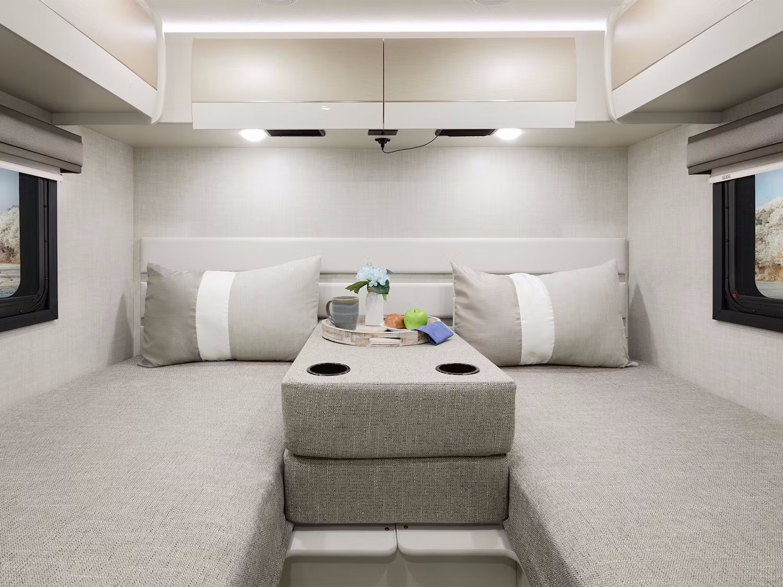 - Recharge in comfort after a full day of exploring in the Gemini AWD®. The 23TW and 24JG layouts feature a smart flip-up Queen-size bed with cushioned seating below, maximizing space and functionality. For couples or friends traveling together, the 24KB offers twin beds that easily convert into a spacious King. In the Gemini® TRIP 22MT, the electric drop-down Queen-size SkyBunk® bed lowers with the push of a button. It can be adjusted to fit your gear below, making it an ideal choice for solo adventurers or outdoor enthusiasts who crave flexibility on the road.
