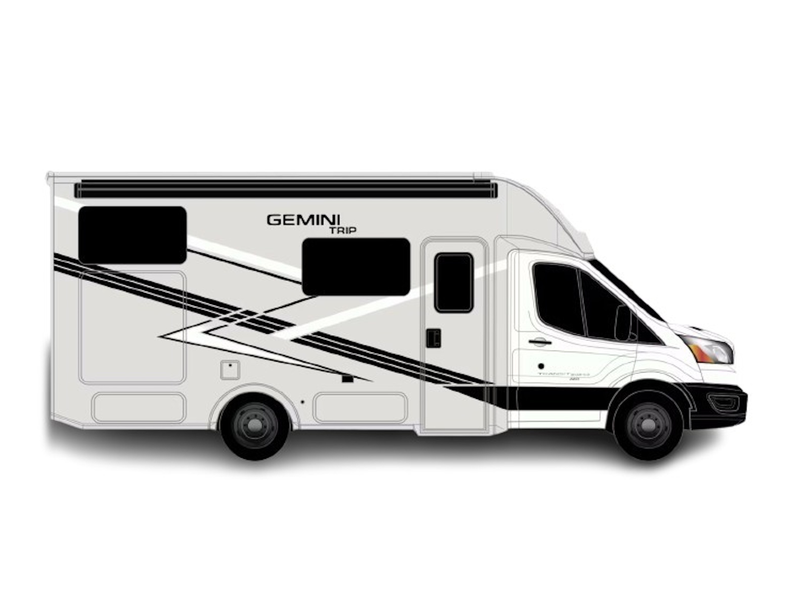 - The Gemini AWD® makes a bold impression with its modern exterior and black frameless windows. Black aluminum wheels and an optional paint or graphics package enhance its sleek design, while its compact build makes navigating tight roads a breeze. Kick back under the power patio awning with integrated LED lighting and enjoy the perfect outdoor setup. The Gemini® TRIP takes it further with off-road-inspired fender flares and a front grille accented by extra LED clearance lights. Pack all your gear in the MEGA-Storage™, which has rear and camp-side access, built-in cubbies, and a floor drawer.