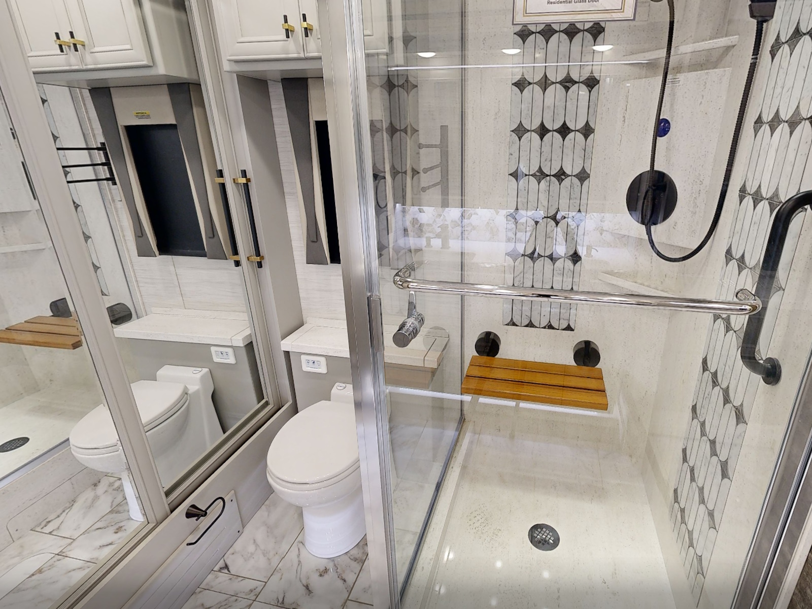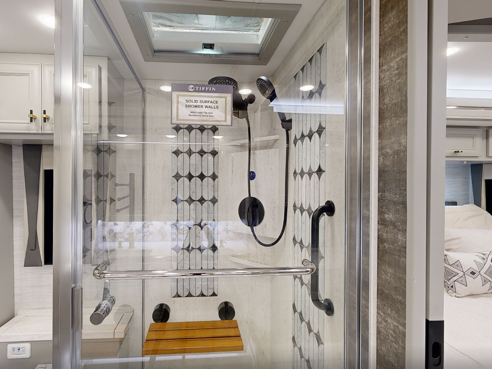 Shower Skylight | Shower LED Light with Sliding Cover | Shower Head with Detachable Hand-held Shower Wand | Teak Folding Shower Seat | Aqua View Showermiser™ | Exterior Rinse Hose with Shower Head