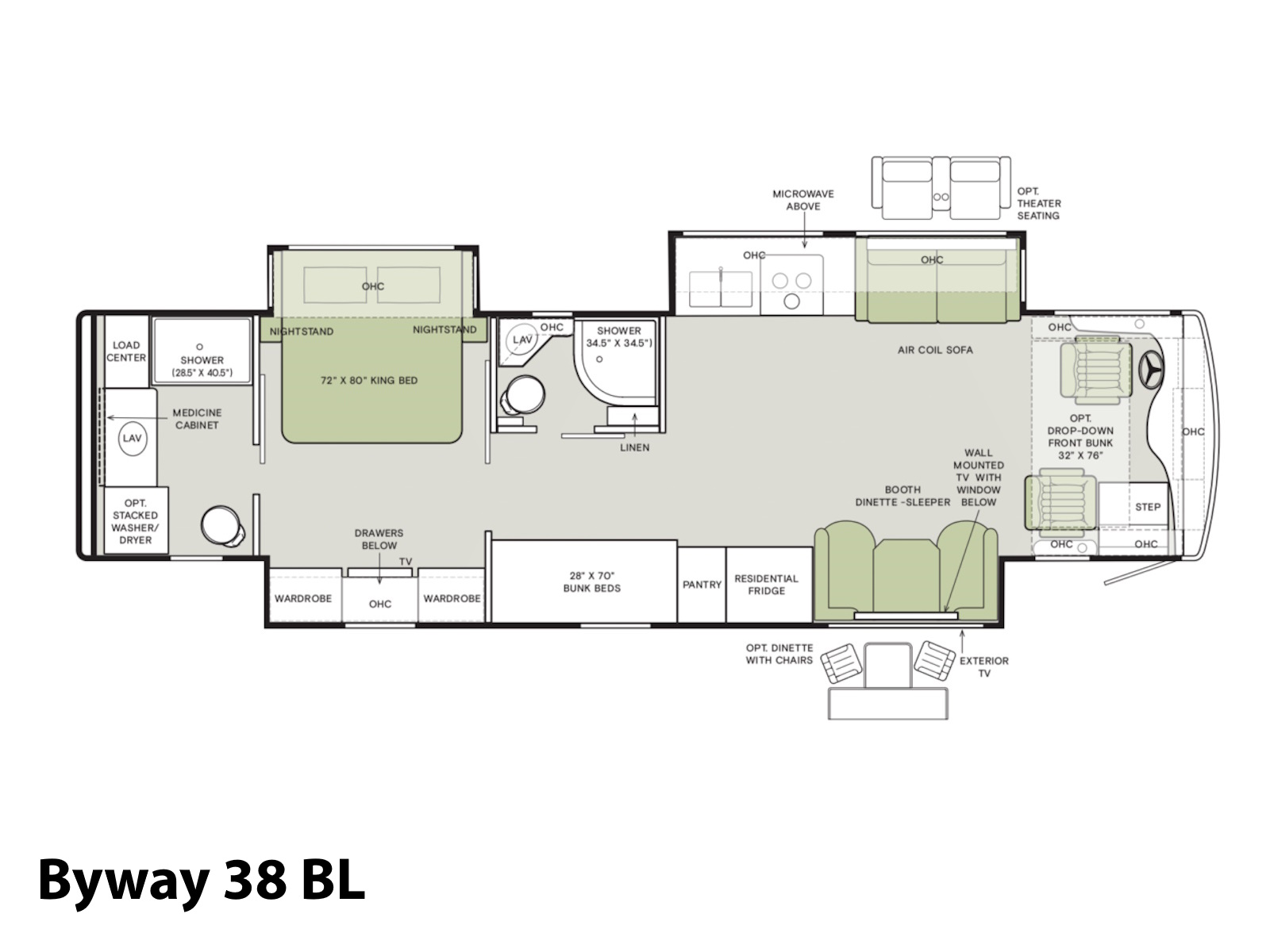 The 2026 Byway offers three unique floor plans that can tailor to the lifestyle you’re looking for. Ranging from 35′ 2″ to 39′ 6″ in length, you can opt for the shorter, 1-bath model, or if you frequently have family and guests traveling with you, our 2-full bath bunk model might be the perfect choice for those long road trips. No matter the floor plan you choose, you’ll travel in luxury with the many standard features Tiffin includes in the Byway, making every adventure one to remember.