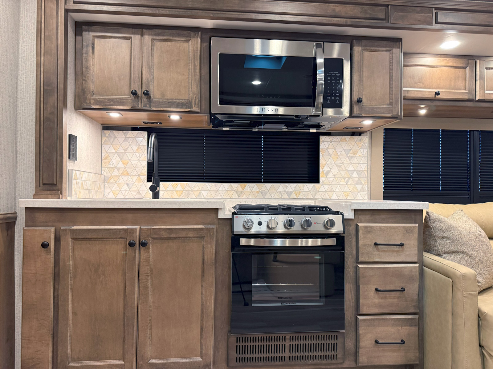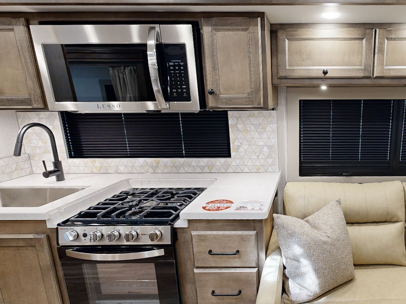 Three-Burner Liquid Propane Cooktop | Solid Surface Galley Countertop, Sink, and Cooktop Cover