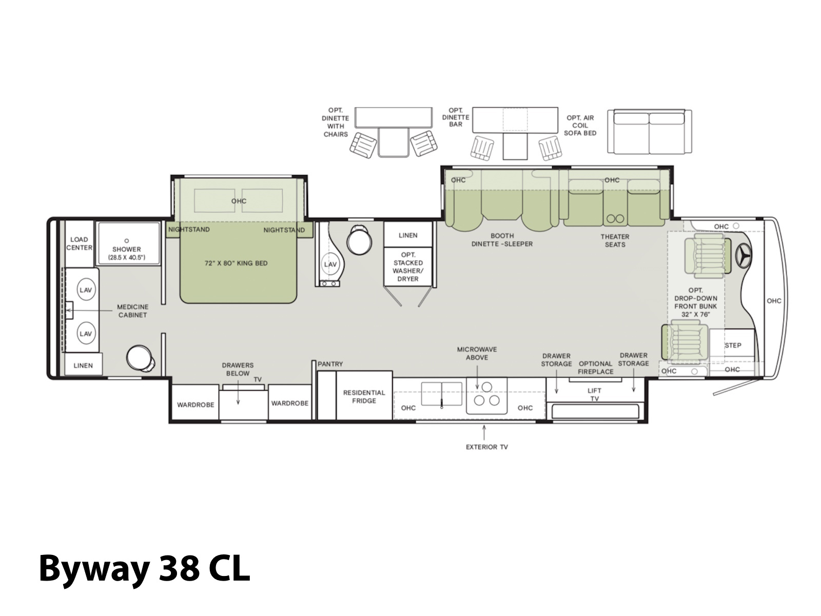 The 2026 Byway offers three unique floor plans that can tailor to the lifestyle you’re looking for. Ranging from 35′ 2″ to 39′ 6″ in length, you can opt for the shorter, 1-bath model, or if you frequently have family and guests traveling with you, our 2-full bath bunk model might be the perfect choice for those long road trips. No matter the floor plan you choose, you’ll travel in luxury with the many standard features Tiffin includes in the Byway, making every adventure one to remember.
