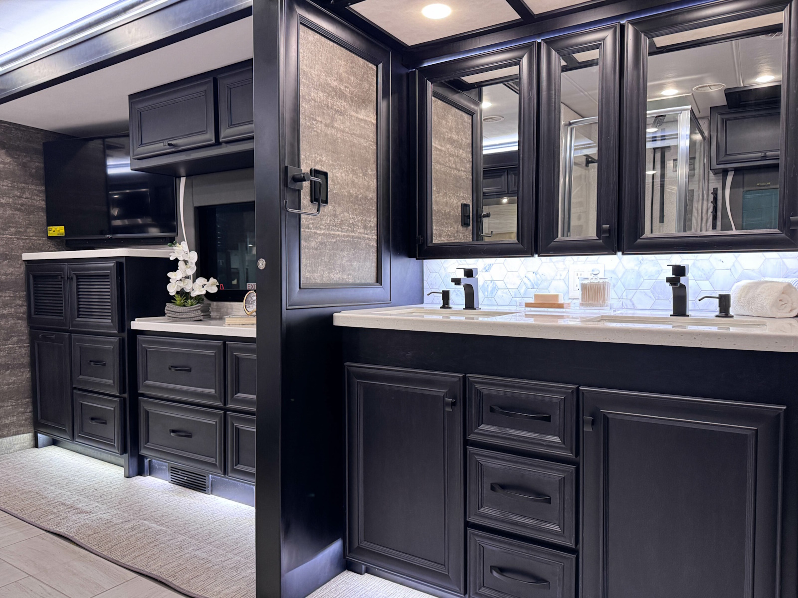 Mounted Bedroom TV | Living Area TV | Exterior TV with Soundbar | Fast Charge USB ports within Exterior TV Compartment