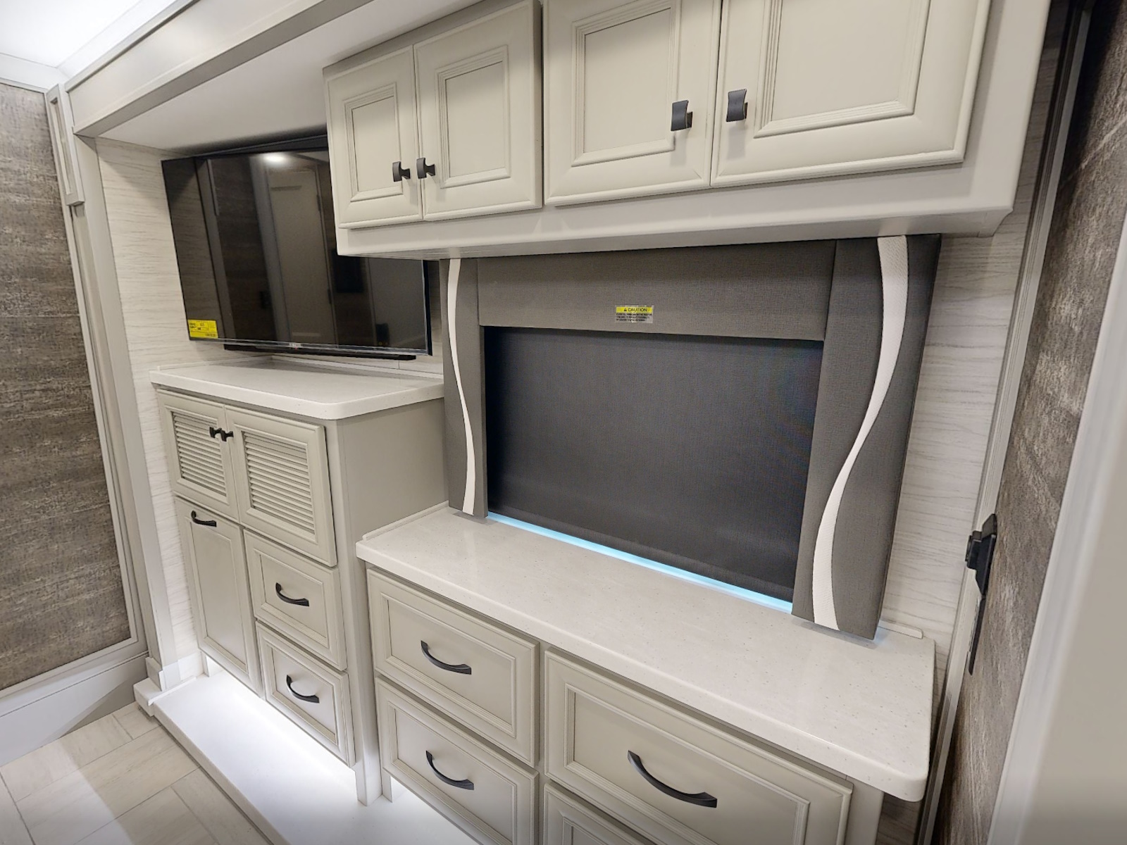 Mounted Bedroom TV | Living Area TV | Exterior TV with Soundbar | Fast Charge USB ports within Exterior TV Compartment