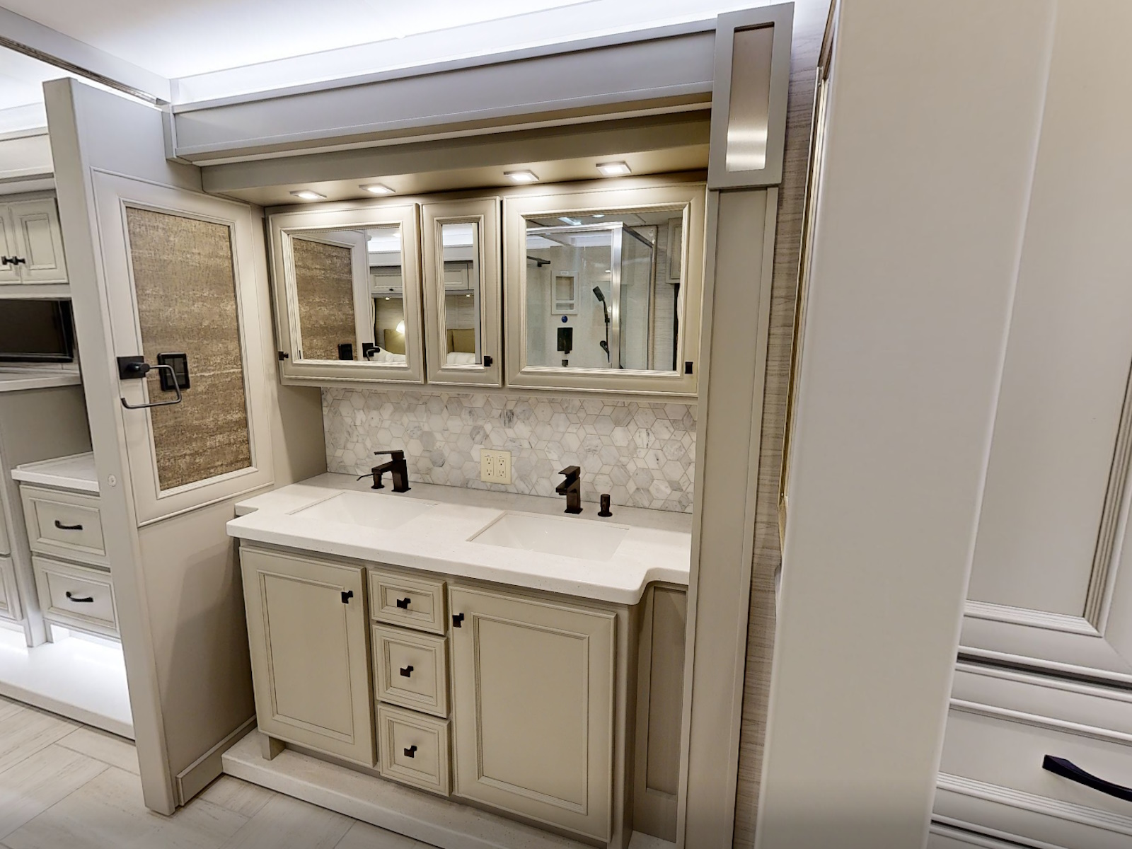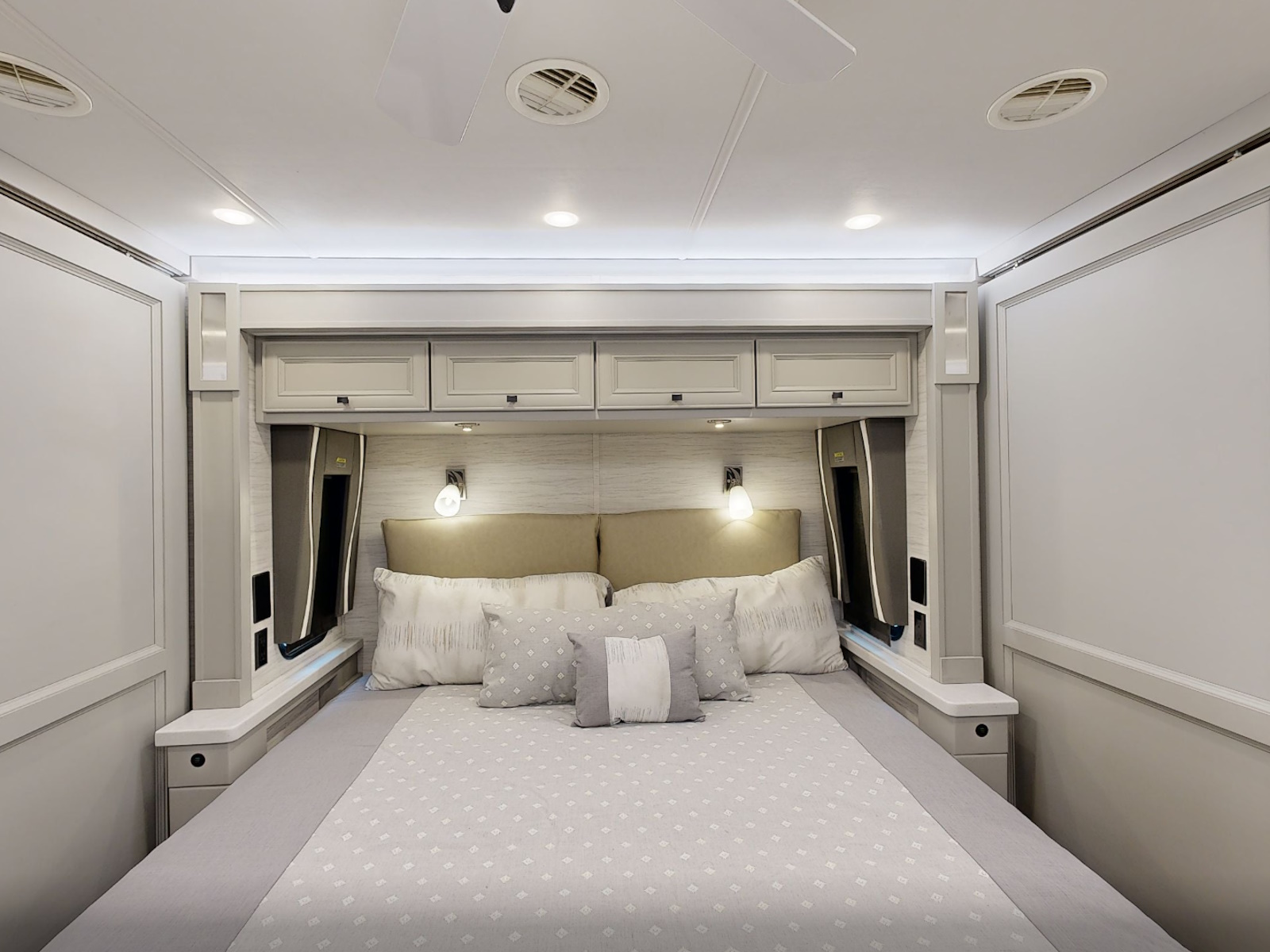 Mounted Bedroom TV | Living Area TV | Exterior TV with Soundbar | Fast Charge USB ports within Exterior TV Compartment