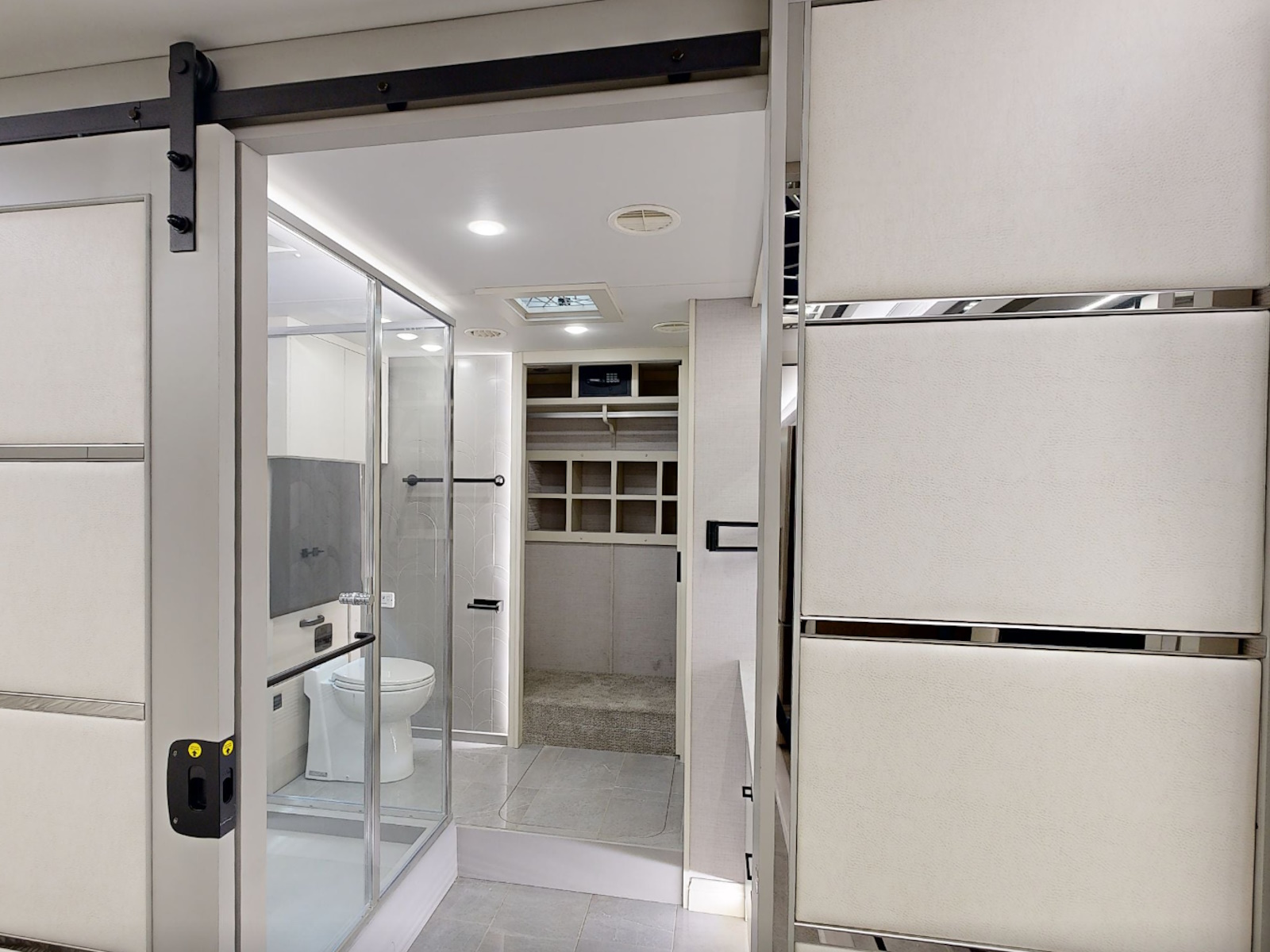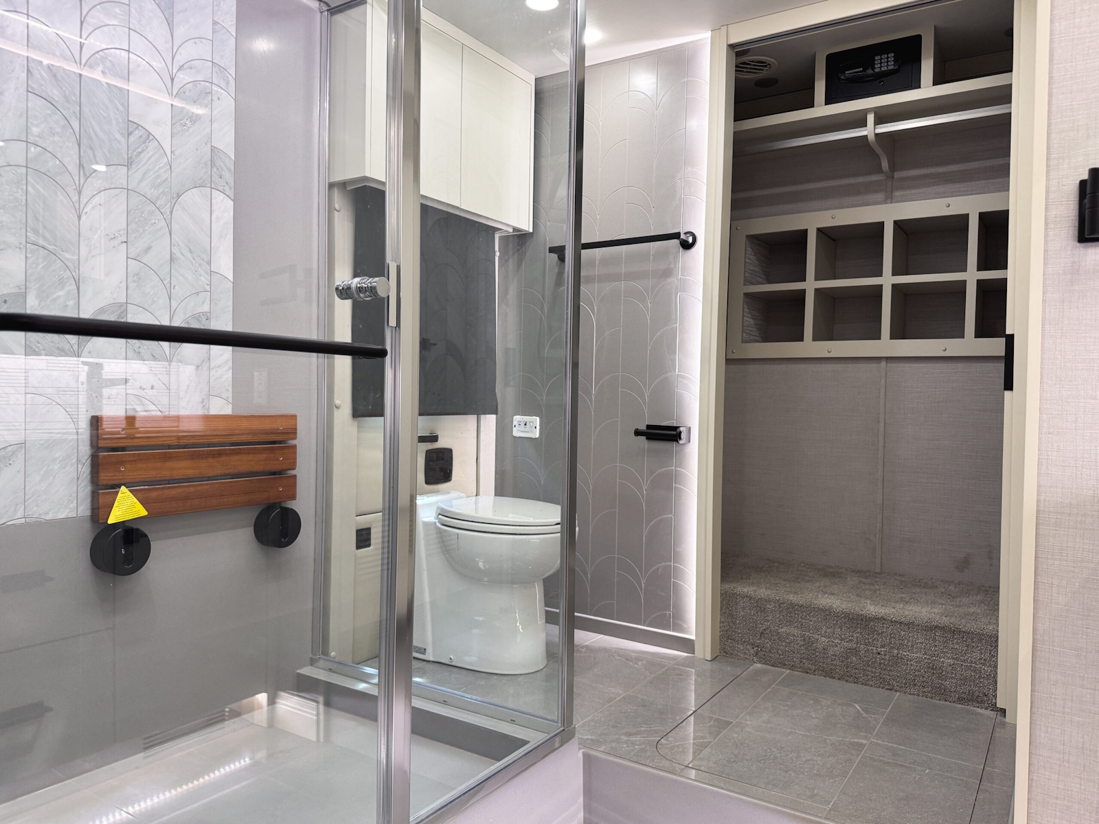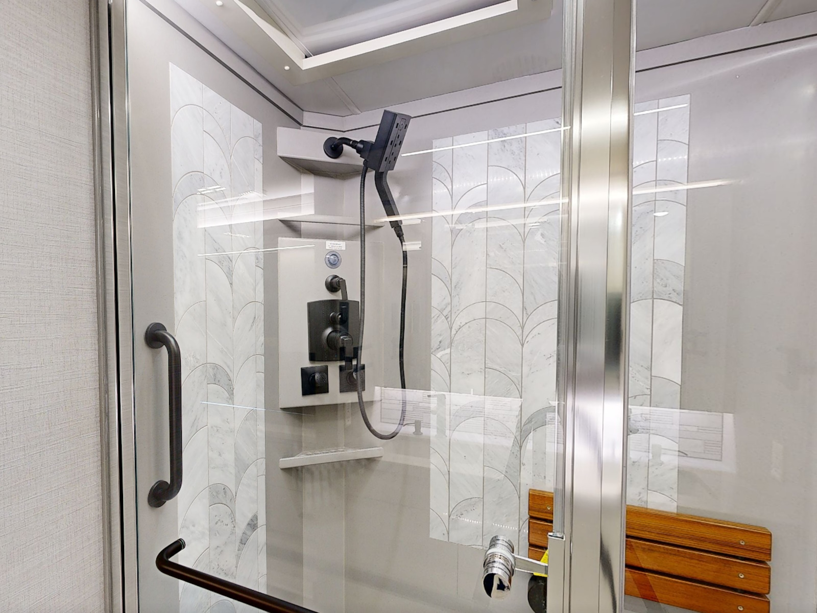 Exterior Rinse Hose with Shower Head | Aqua View Electronic Showermiser™ | Solid Surface Shower Walls with Inlaid Tile and Residential Glass Door (34 in x 52.5 in ) | Teak Folding Shower Seat | Shower Head with Detachable Hand-held Shower Wand | Shower LED Light with Sliding Cover | Shower Skylight