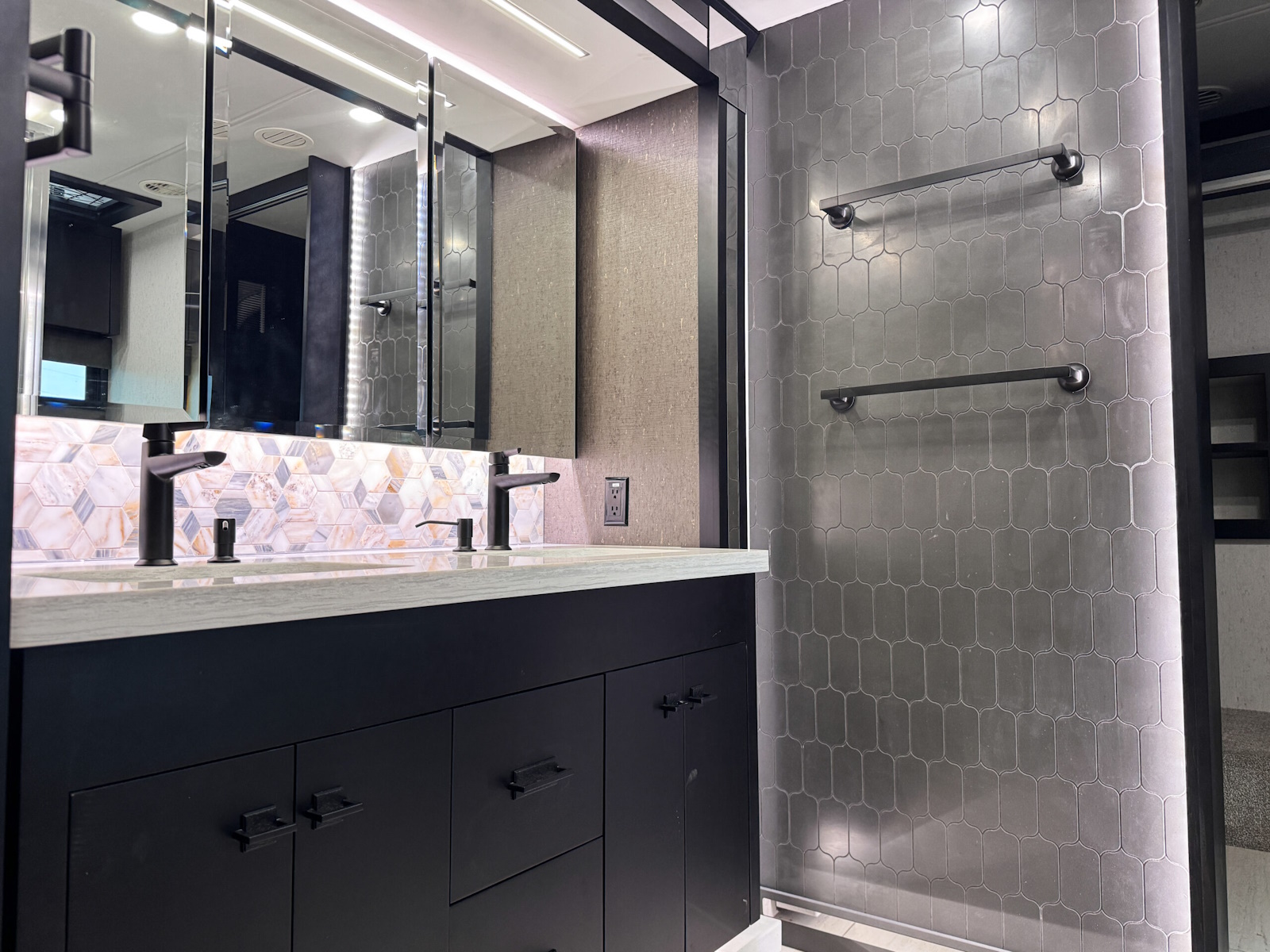 Mounted Bedroom TV | Living Area TV | Exterior TV with Soundbar | Fast Charge USB ports within Exterior TV Compartment