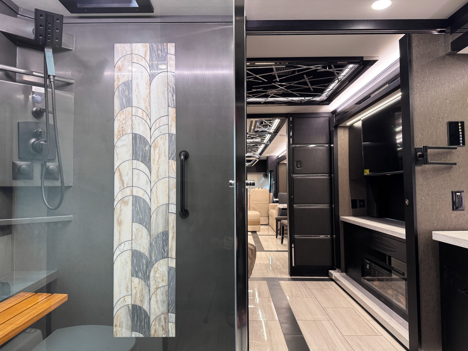 Exterior Rinse Hose with Shower Head | Aqua View Electronic Showermiser™ | Solid Surface Shower Walls with Inlaid Tile and Residential Glass Door (34 in x 52.5 in ) | Teak Folding Shower Seat | Shower Head with Detachable Hand-held Shower Wand | Shower LED Light with Sliding Cover | Shower Skylight